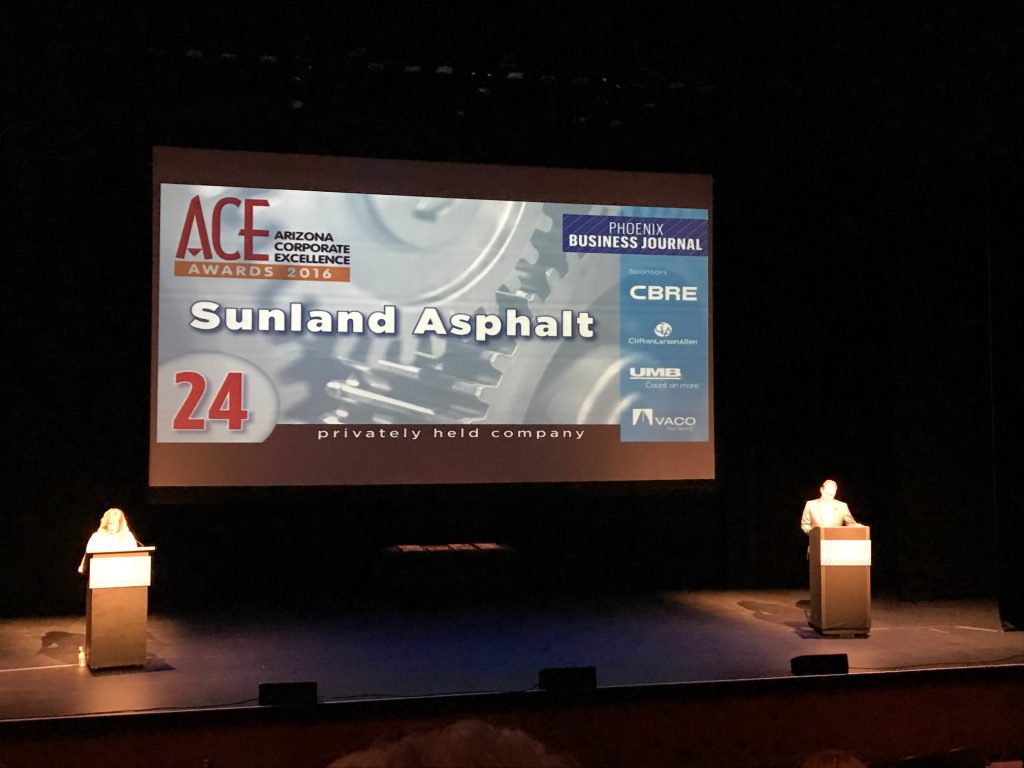 Each year, the Phoenix Business Journal recognizes privately held companies throughout the Valley through the Arizona Corporate Excellence (ACE) Awards.  Sunland Asphalt was recognized as the 21st Fastest Growing Company and the 24th Top Privately Held Company in Arizona. The goal of the ACE Awards is to develop an increasing sense of knowledge-sharing and community among